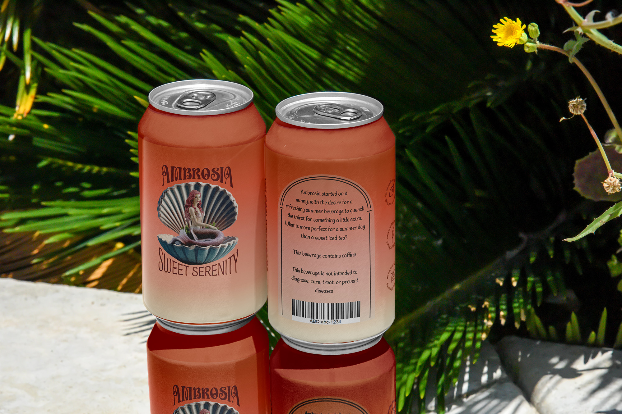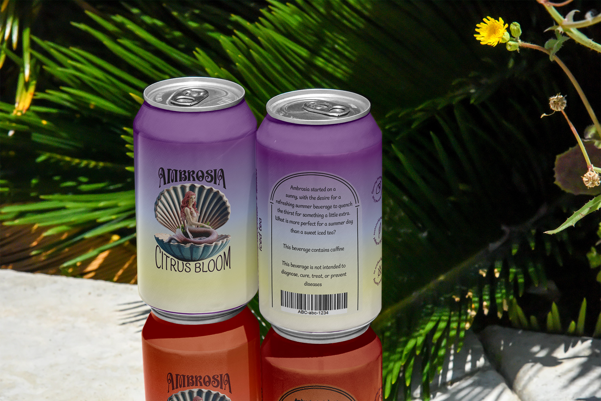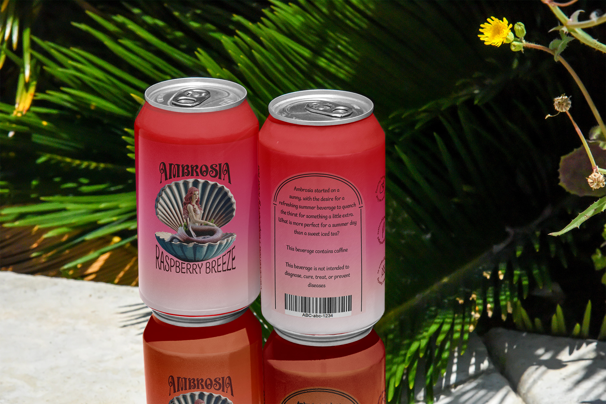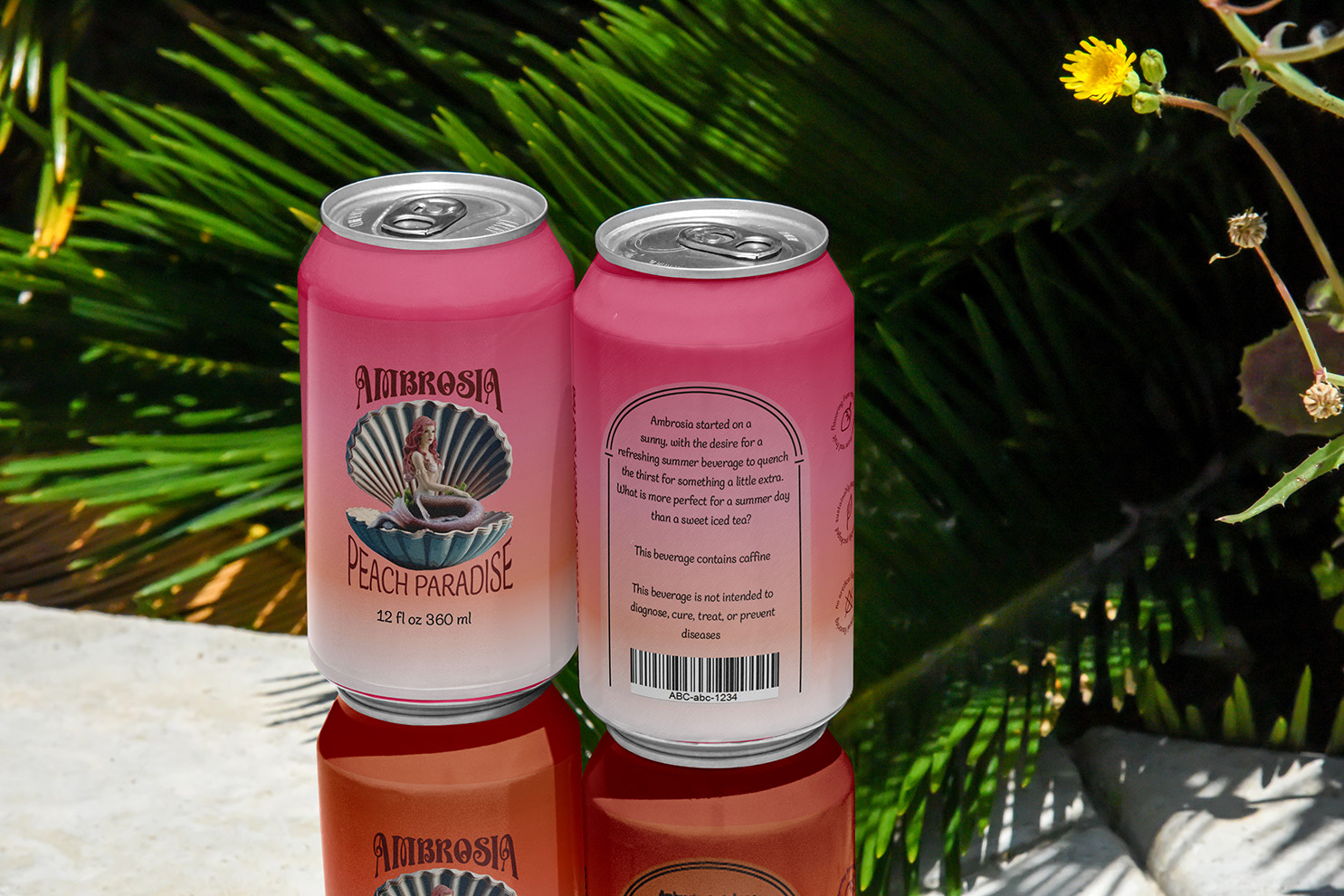 Ambrosia started on a sunny day, with the desire for a refreshing summer beverage to quench the thirst for something a little extra. What more perfect for a summer day than a sweet iced tea? Sustainably packaged and made with no desire for artificial sweeteners or artificial flavors. Inspired by both the tea Ambrosia and the Greek term for drink of the gods. Ambrosia is not just tea, but an experience and art in a can. Perfect for the summer, whether you just need a drink on a hot day, to relax after your day, or to savor the moment.